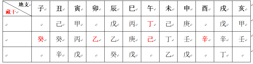 十三、十二地支暗藏:子藏癸,丑藏癸辛己,寅藏甲丙戊,卯藏乙,辰藏乙戊癸,巳藏丙戊庚,午藏丁己,未藏己丁乙,申藏庚壬戊,酉藏辛,戌藏戊辛丁,亥藏甲壬。
