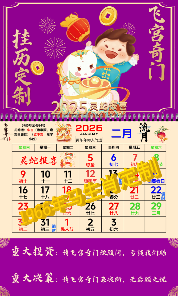自己好不算好,还要让您的客户们更好!他们好了,您我才能更好,过年了,关注您的客户气运等于在帮助您事业,用【飞宫奇门】2025年挂历送客户,会怎样?您只需问清客人出生年,我们就立马为您推算出您客户2025年的运气、并制成挂历(1套也做),这样下来您不单是送于客人礼品,还是帮助客人把握好运。