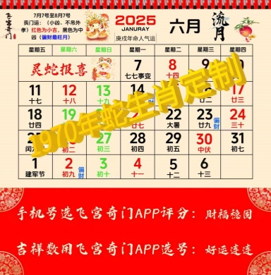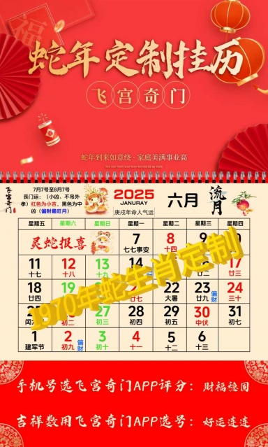 以下挂历是以奇门遁甲文化为核心,再根据1970(狗)年出生人、的生年来计算2025岁流年中12月的气运,再通过12个月计算出每个月30天的气运,然后将气运完整的体现在挂历上,从而让1970年出生的人士、能准确无误的掌握今春流年的好运与财富
