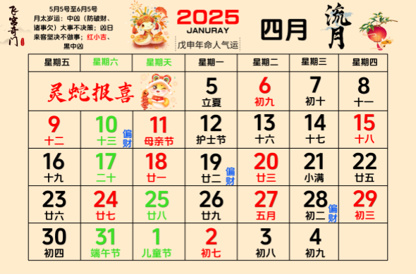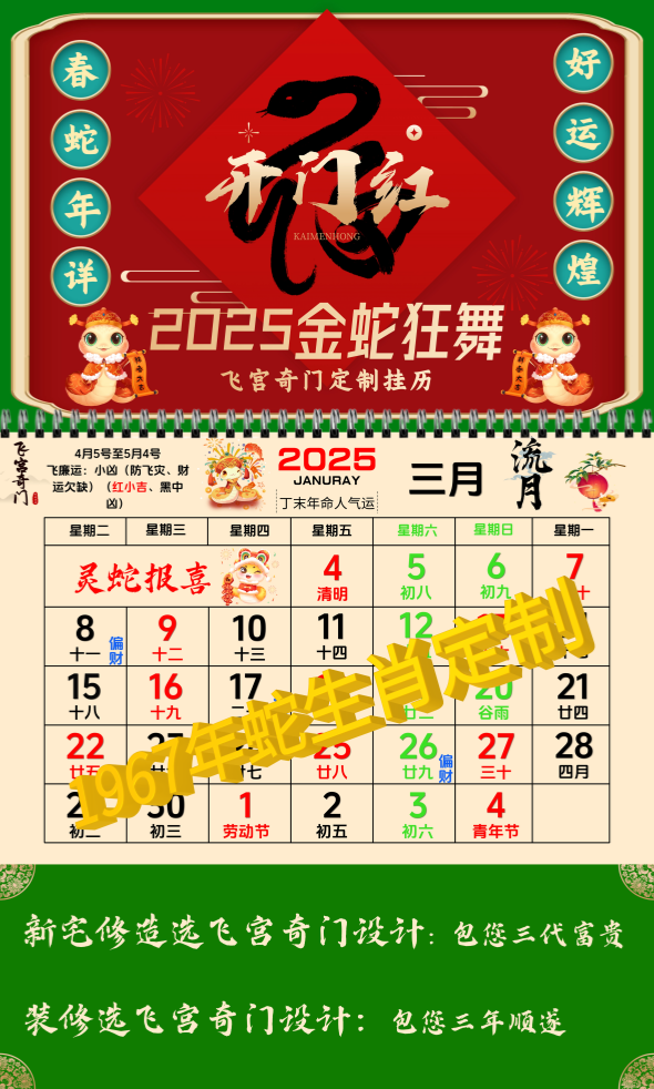 以下挂历是以奇门遁甲文化为核心,再根据1968(猴)年出生人、的生年来计算2025岁流年中12月的气运,再通过12个月计算出每个月30天的气运,然后将气运完整的体现在挂历上,从而让1968年出生的人士、能准确无误的掌握今春流年的好运与财富。