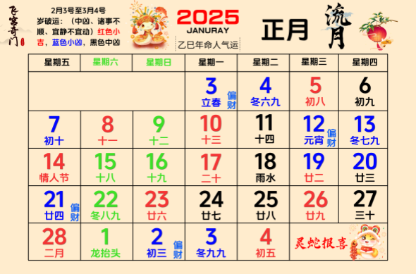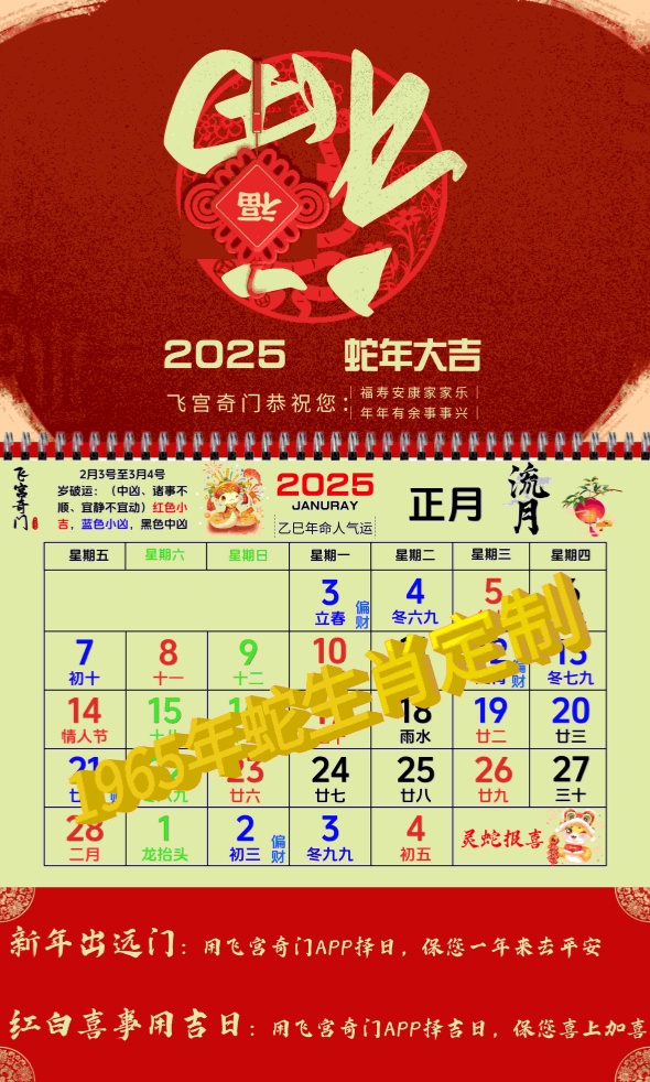 以下挂历是以奇门遁甲文化为核心,再根据1965(蛇)年出生人的生年来计算2025流年中12月的气运,再通过12个月计算出每个月30天的气运,然后将气运完整的体现在挂历上,从而让1965年出生的人士、能准确无误的掌握未来的好运与财富。