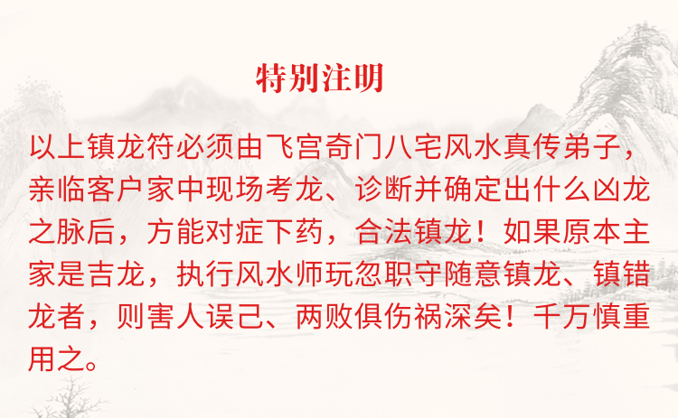 4、镇死龙:死龙是指主家在修建家宅时因没有专业老师指导,碰巧将家中的正脉修在了空亡无龙气流动的地带,吉龙来不朝这里过,凶龙来不朝这里走,谓之死地,“死地出愚人”,故座在此龙上的人家出的孙子必然愚钝、特别容易出低智儿和子孙越来越稀少直到没有后人;上符对死龙的镇破效力可达60——80%